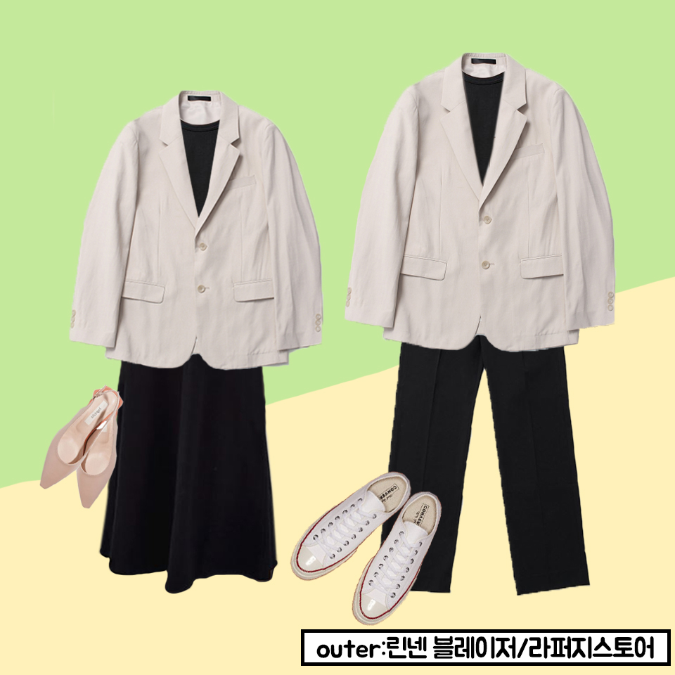 같은 아이템, 같은 무드를 지닌 블레이저 커플룩